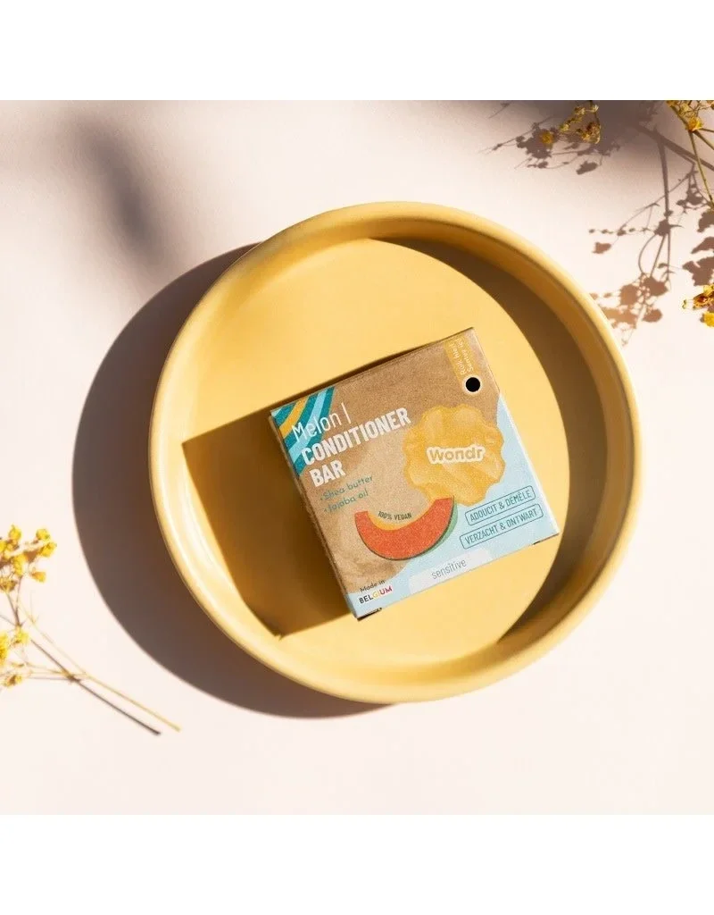 Fris, fruitig en zijdezacht: zó voelt jouw haar met de Sweet Melon conditioner bar. WONDR conditioner bars zijn extra geconcentreerd en bestaan voor maar liefst 30% uit voedende boters. Gebruik deze solid conditioner met frisse meloengeur samen met de Sweet Melon shampoo bar voor de perfecte combo.